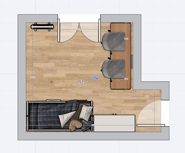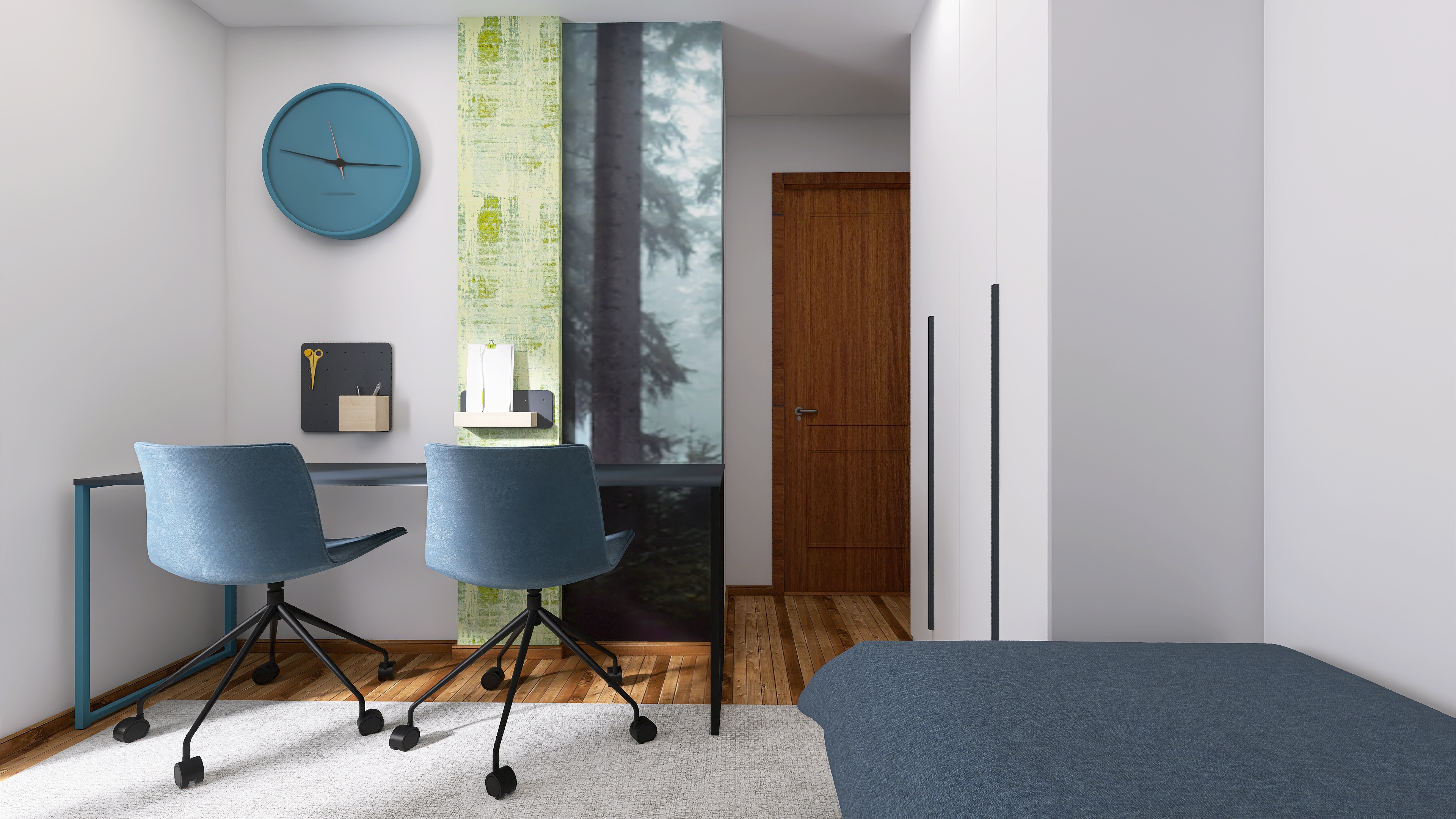 Smještanjem kreveta na kat po mjeri pokraj balkonskih vrata, otvara se mogućnost dodavanja još jednog elementa u prostor poput police za knjige ili većeg garderobnog ormara te izdašne radne površine od zida do zida. Budući da su dječaci predškolarci, taj prostor se do polaska u školu može jednostavno urediti u prostor za igru, a naknadno dodati radni stol po mjeri sa stolicama za učenje. Ovdje je zadržan postojeći ormar.