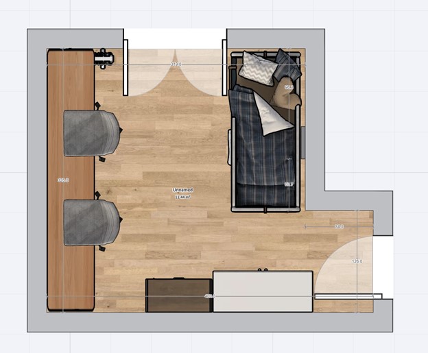 Postojeći krevet i ormar naizgled stanu na najduži zid, no, međutim, kako bi u prostor stali pisaći stolovi koji će dječacima ubrzo biti potrebni, drugi krevet mora biti izrađen po mjeri kako bi zaobišao izbočinu na zidu, te bio kraći od 200 cm da bi u ovom rasporedu ulazak u prostoriju uopće bio moguć.