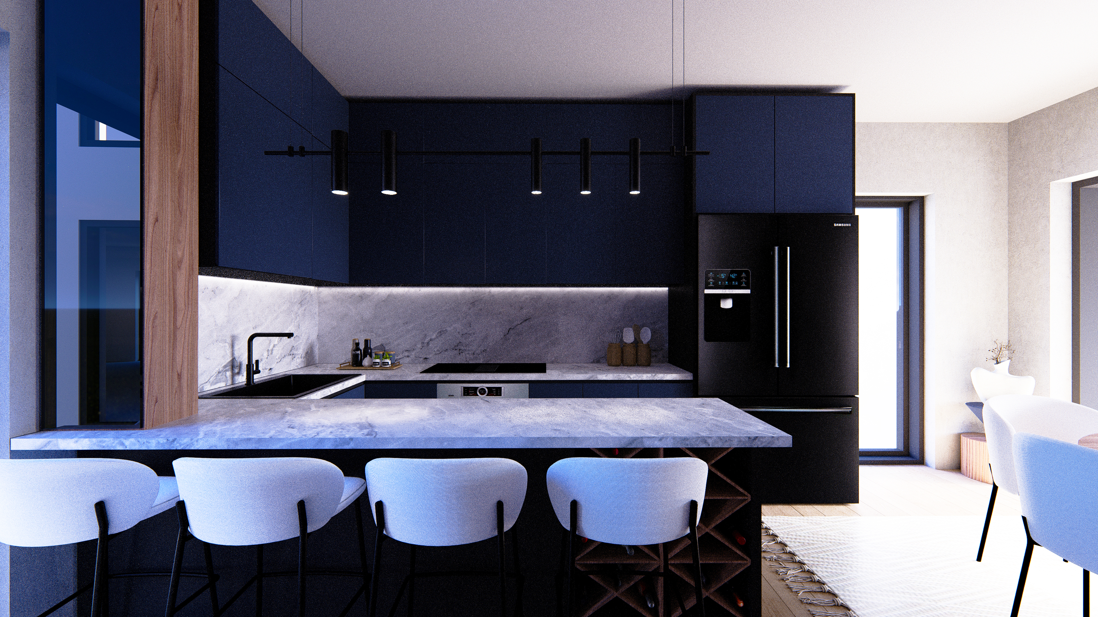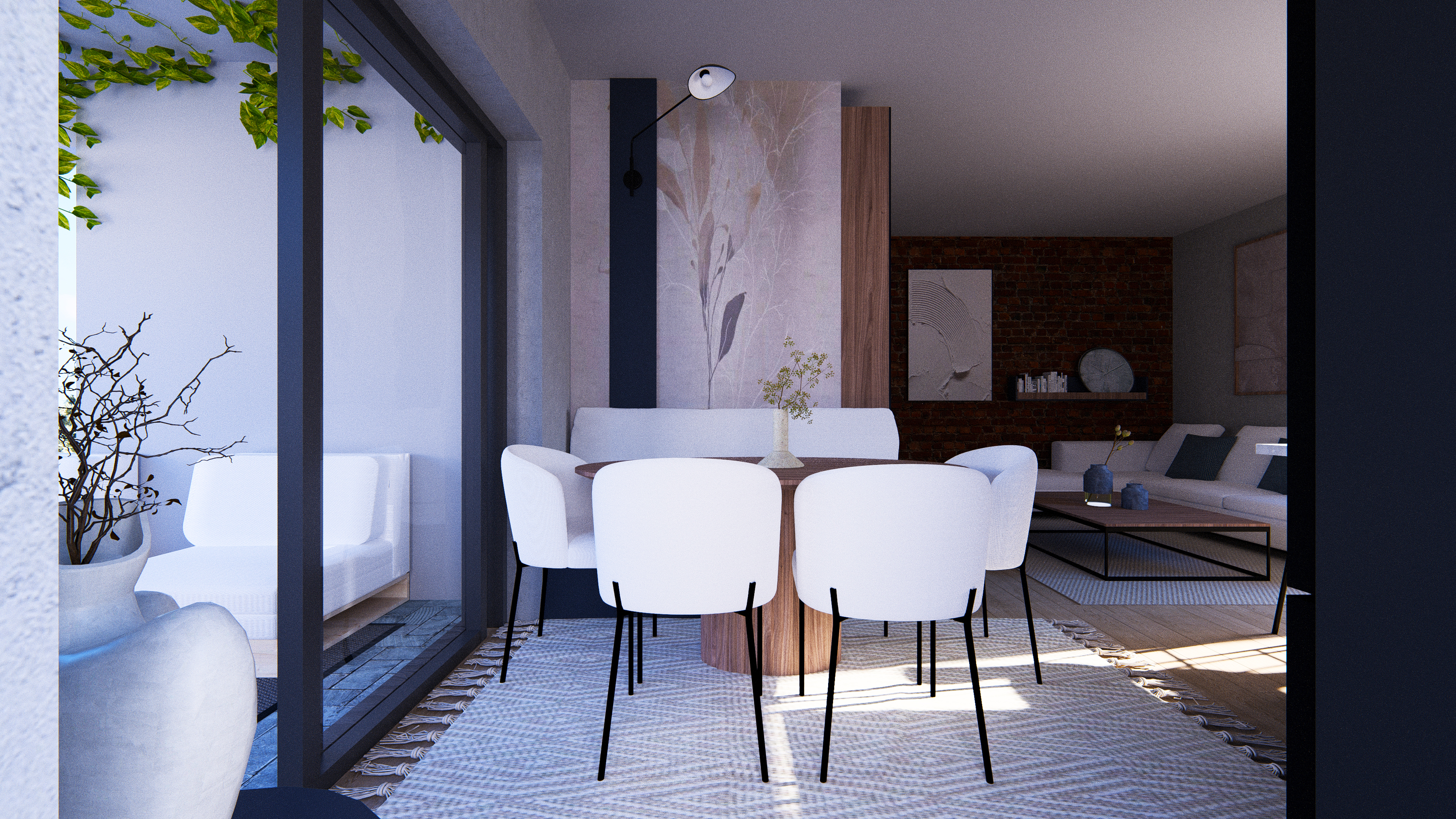 Vizualizacija obuhvaća dnevni open space koji se sastoji od kuhinje, blagovaonice i dnevnog boravka s izlazom na veliki natkriveni balkon.