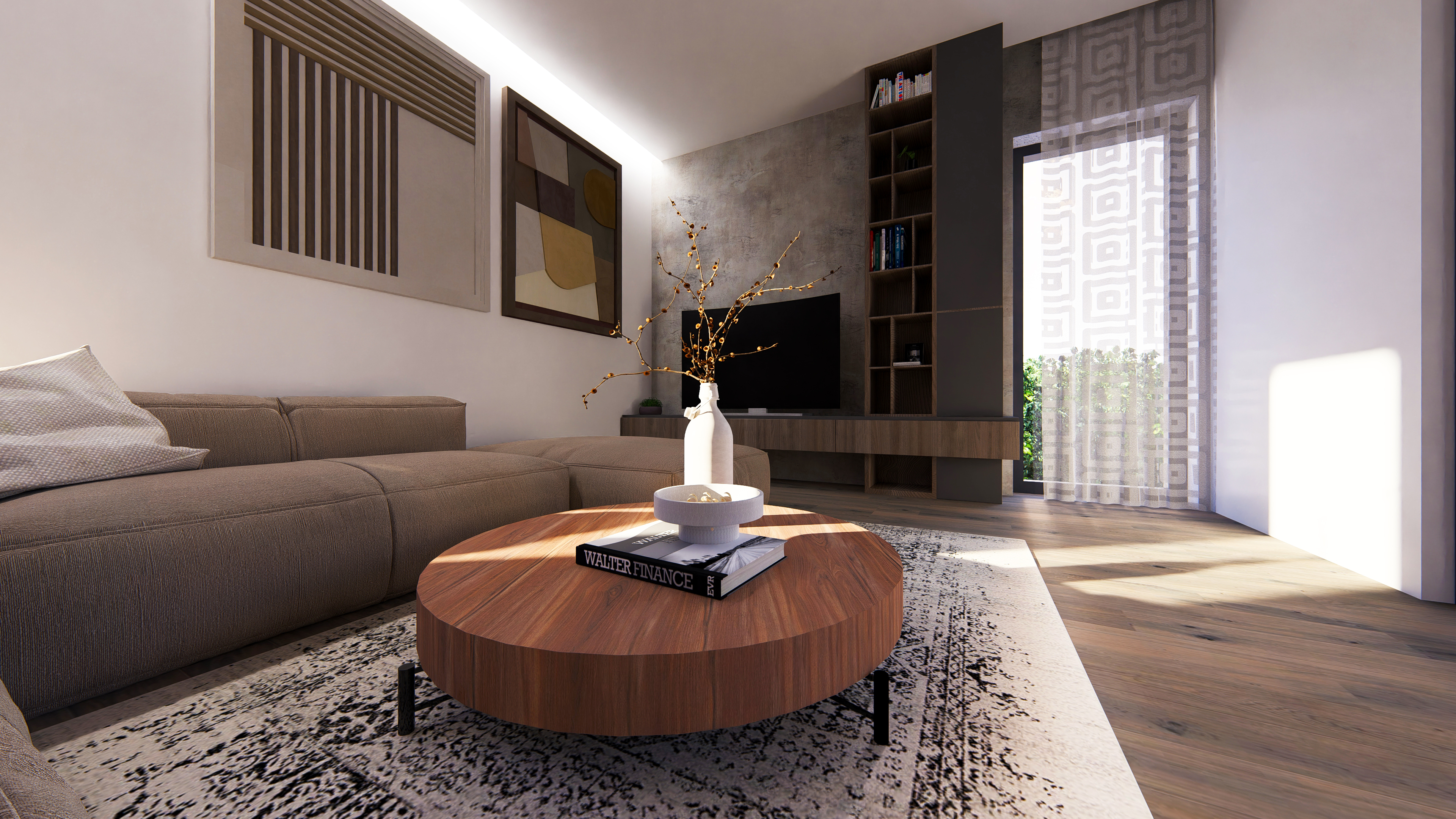 Vizualizacija obuhvaća dnevni open space koji se sastoji od blagovaonice, dnevnog boravka i knjižnice s izlazima na veliki natkriveni balkon s pogledom na more.