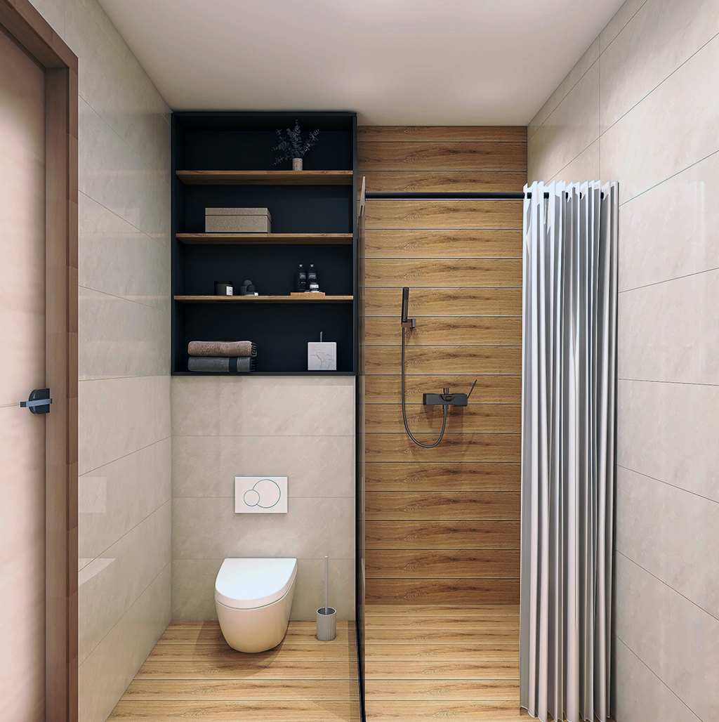 Ova kupaona odlikuje se prvenstveno fukncionalnošću, prilikom renovacije ugrađeno je podno grijanje kao i wc školjka-bide. Bojama pločica postignuto je vizualno odvajanje prostora tuša od ostatka prostora.