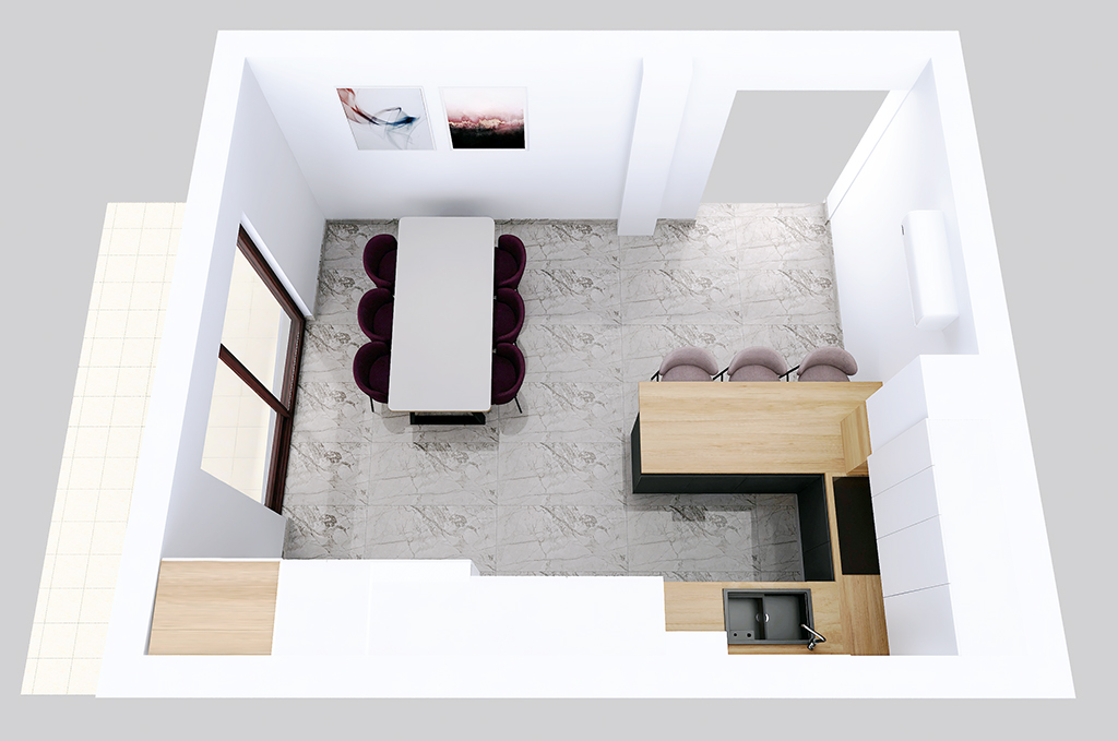 Tijekom kompletne renovacije stana, klijent se odlučio za pomoć oko dizajna nove kuhinje. Zbog uklanjanja nosivog zida, rješenje treba uzeti u obzir novonastale izbočine na stropu i zidovima.
