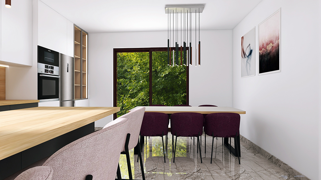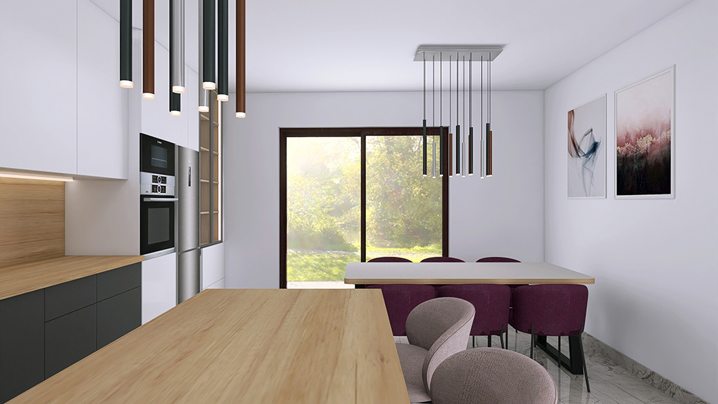 Postojeći prostor je proširen i osmišljena je nova, funkcionalna kuhinja s prostranim blagovaonskim stolom koji prima 6 blagovaonskih stolica, šankom s 3 polubarske stolice i dijelom kuhinje s vitrinom koja služi kao izložbena komoda za drago posuđe. Zbog veličine kuhinje, gornji elementi su izvedeni do stropa kako bi se u budućnosti izbjeglo nakupljanje prašine i potreba za čišćenjem velike i teško dostupne površine. Kuhinja je opremljena kvalitetnim aparatima, sadrži napu, ploču za kuhanje, perilicu suđa, ugradbenu mikrovalnu pećnicu, ugradbenu rernu i frižider visine 180 cm. Kuća u kojoj se kuhinja nalazi smještena je u brižno čuvanoj prirodi i prekrasnoj okućnici, tako da se velikim kliznim vratima otvorio novi izlazak na terasu i pogled na zelenilo i cvijeće.